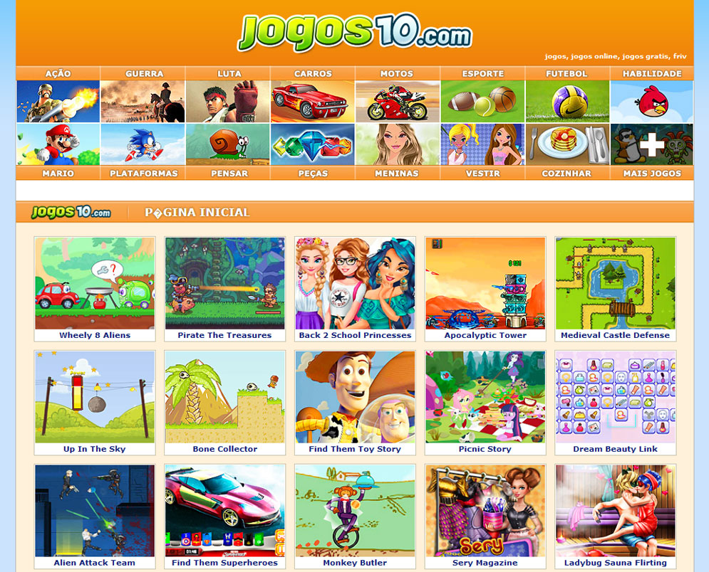 O Jogos 10 é um site português que conta com mais de 9 mil jogos online gratuitos. Para facilitar a pesquisa, os jogos estão divididos em categorias, sendo que as mais procuradas são: Futebol, Mário, Corrida, Moto e Guerra